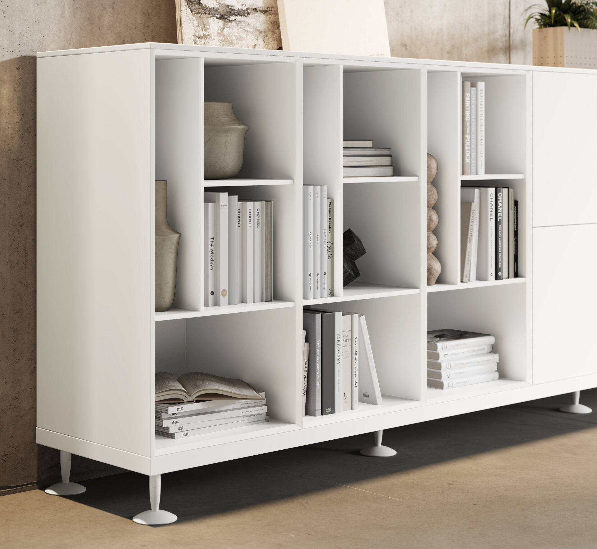 - Modulāri uzglabāšanas elementi ar atvilktnēm, plauktiem un durvīm;