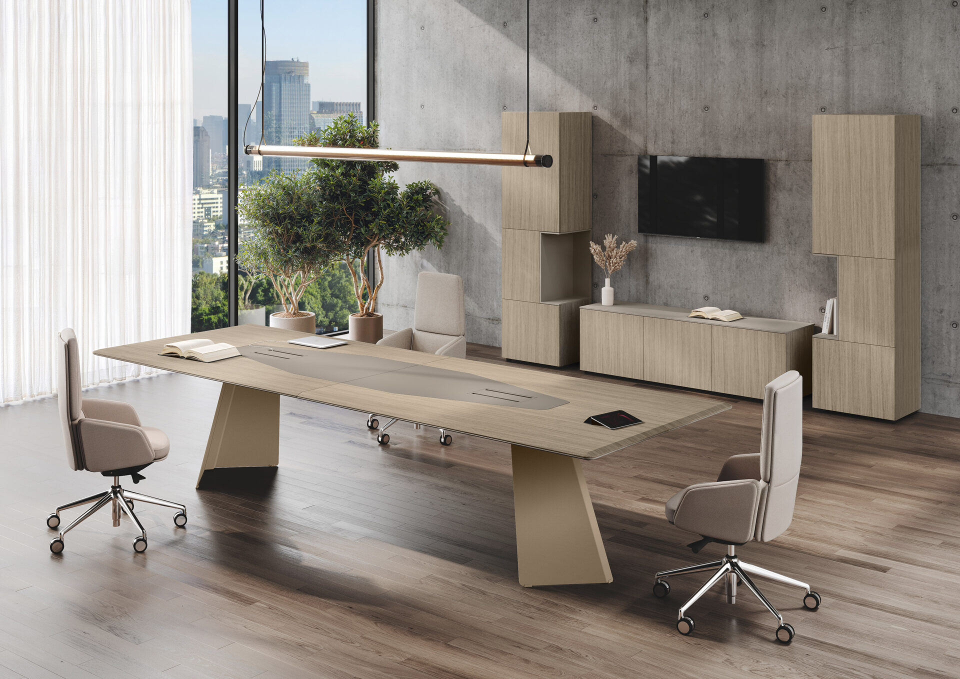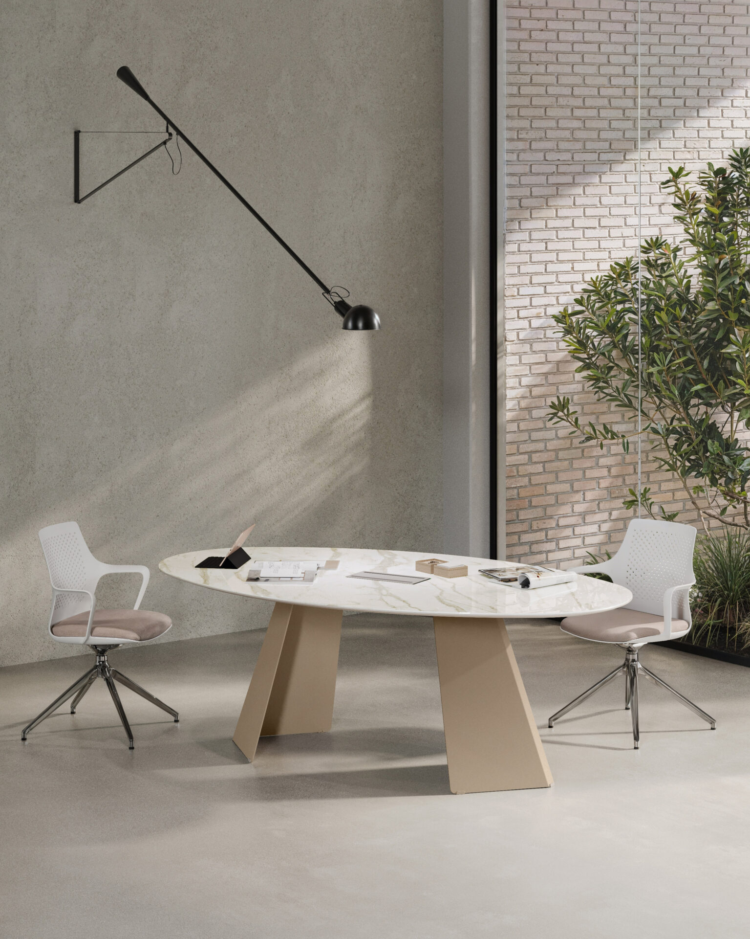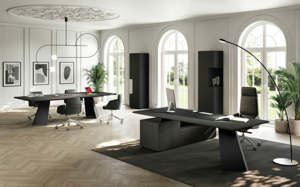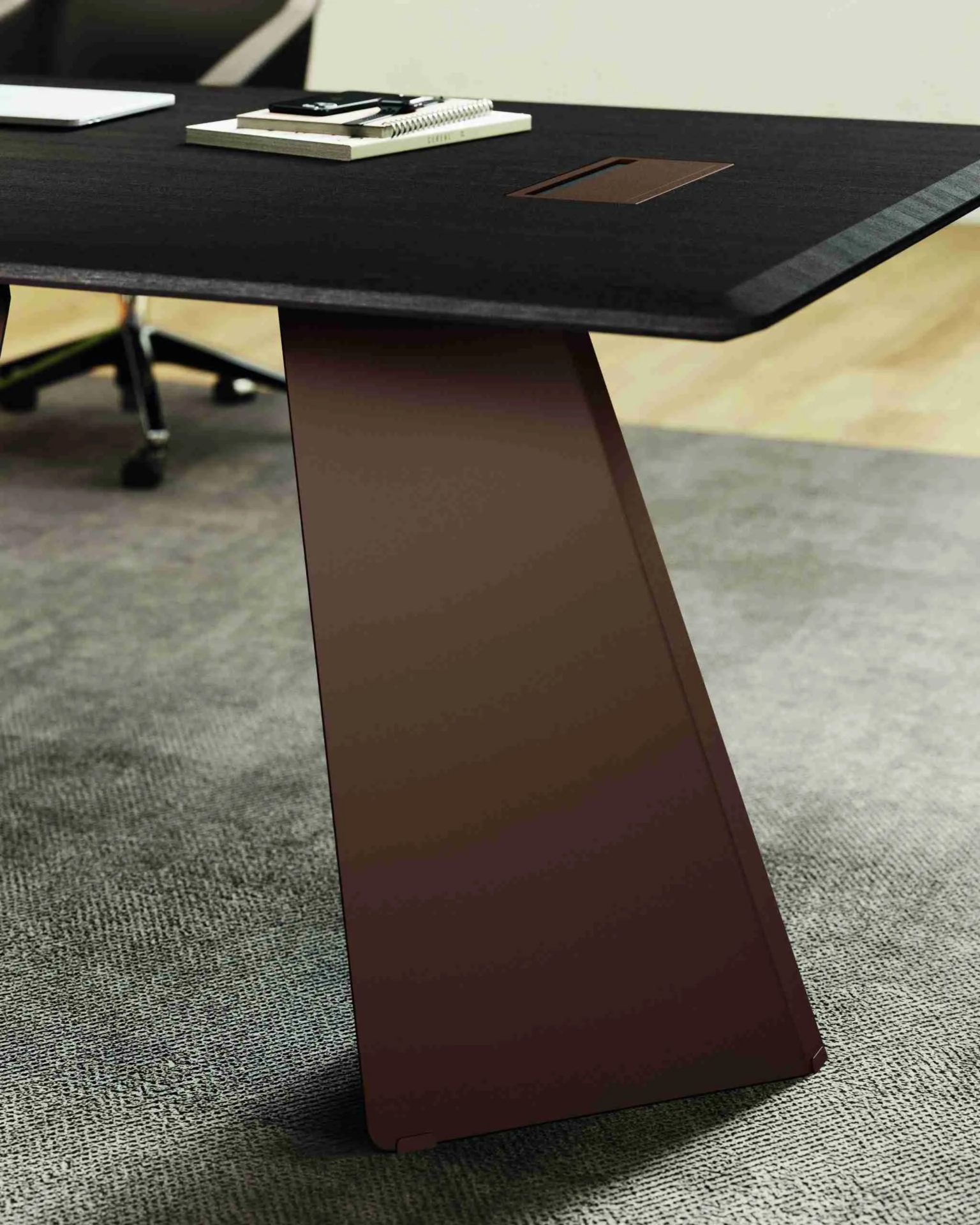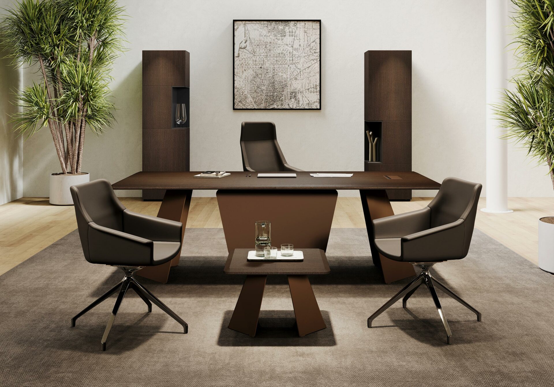 Mūsdienīga vadības klases galdu sistēma, kas apvieno eleganci, izteiksmīgu dizainu un monumentālu vizuālo tēlu. Kolekcija izceļas ar metāla pamatnes arhitektonisko un skulpturālo risinājumu, kas piešķir telpai moderna biroja raksturu un reprezentablu klasi. Tā radīta, lai katru darba vidi padarītu unikālu, vizuāli harmonisku un augstas kvalitātes iespaidu veidojošu.