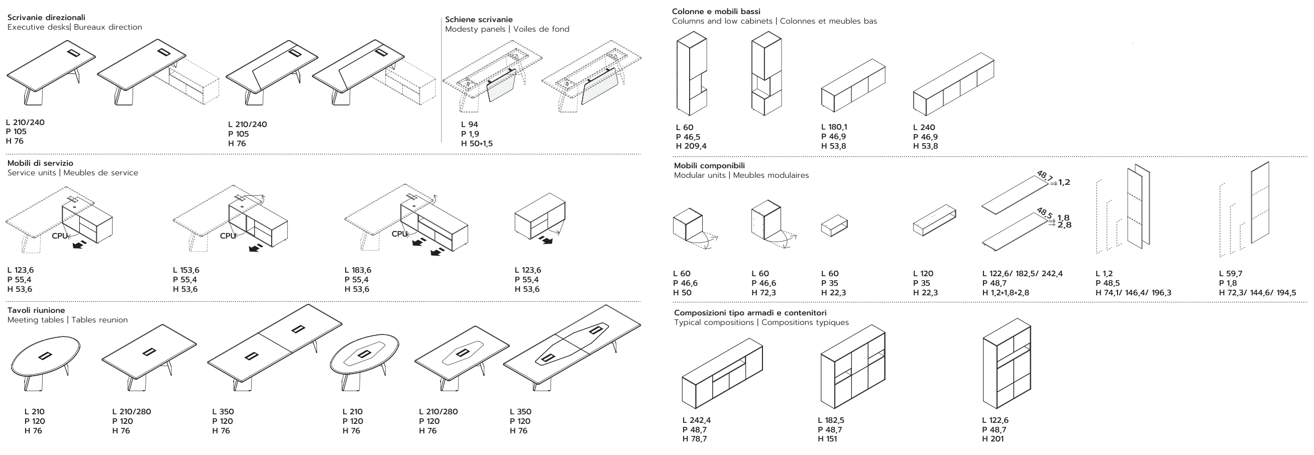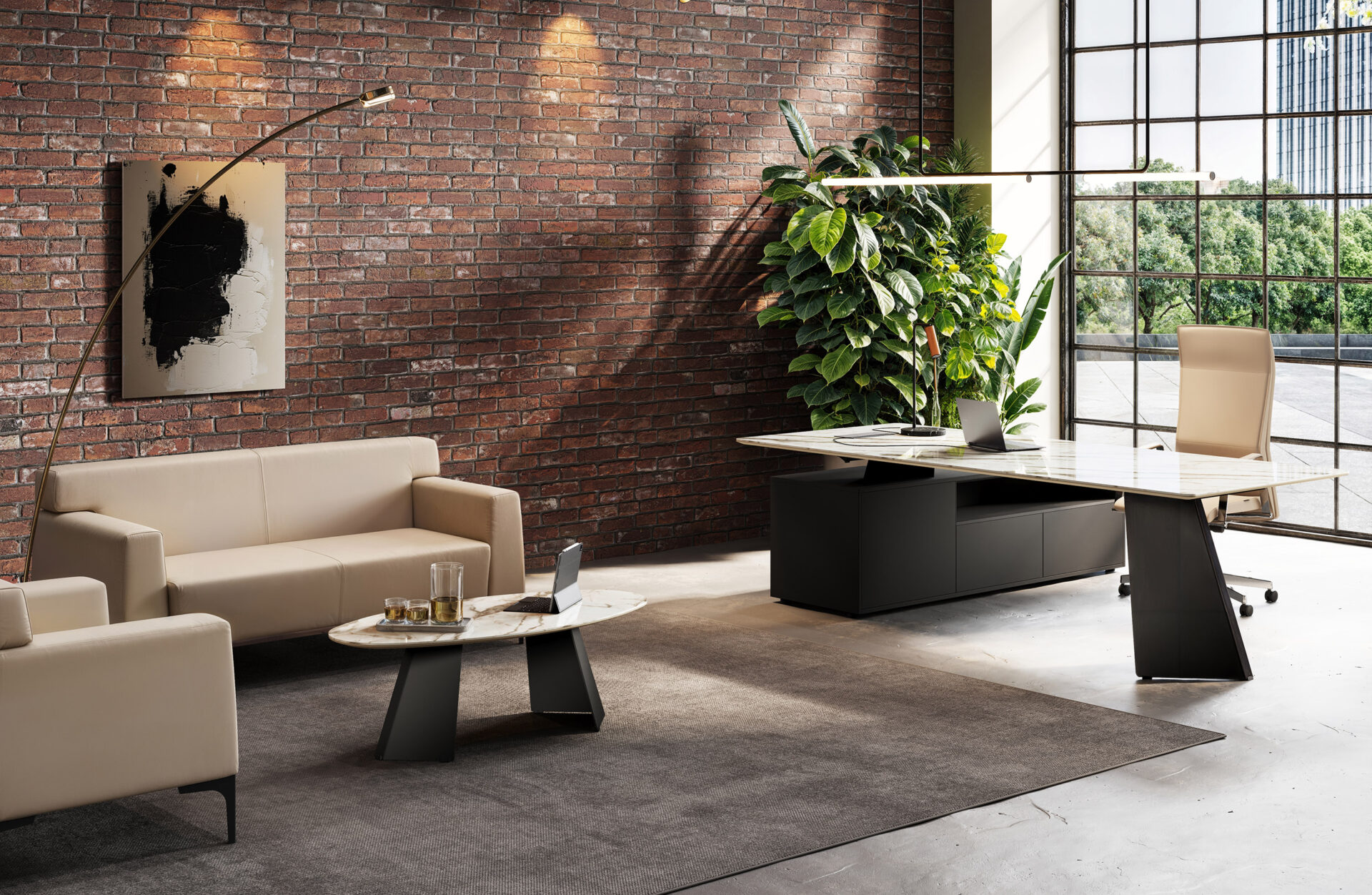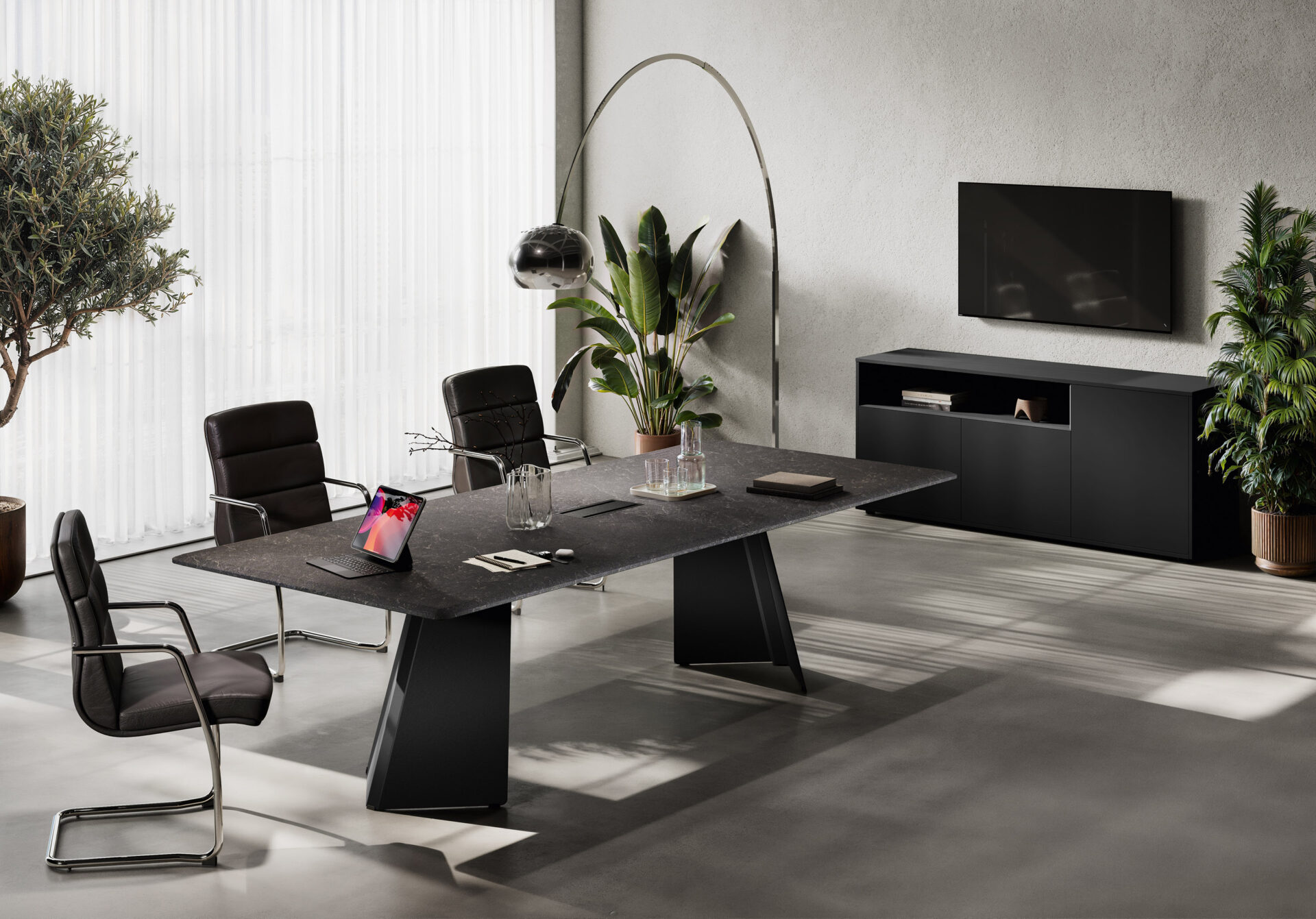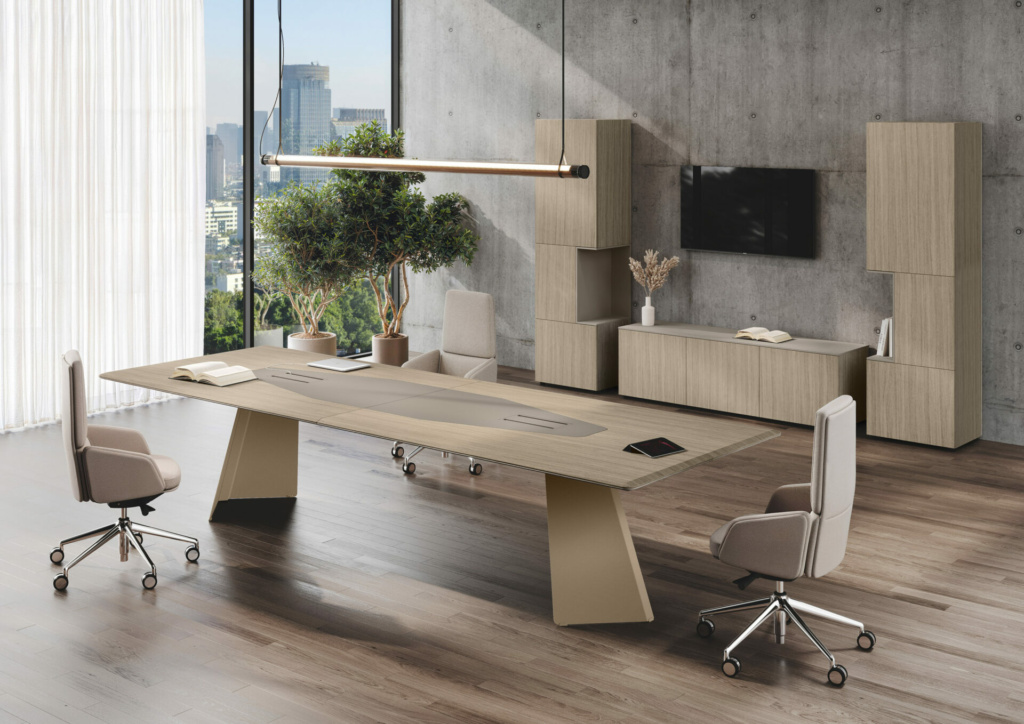 Mūsdienīga vadības klases galdu sistēma, kas apvieno eleganci, izteiksmīgu dizainu un monumentālu vizuālo tēlu. Kolekcija izceļas ar metāla pamatnes arhitektonisko un skulpturālo risinājumu, kas piešķir telpai moderna biroja raksturu un reprezentablu klasi. Tā radīta, lai katru darba vidi padarītu unikālu, vizuāli harmonisku un augstas kvalitātes iespaidu veidojošu.